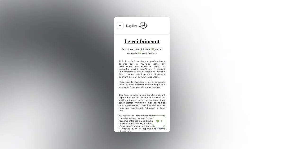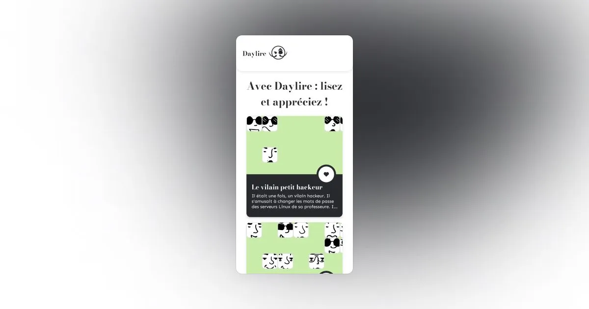 Daylire est une extension du projet "Loufok", conçue pour permettre la consultation des cadavres exquis terminés via une API connectée au backend de Loufok. Cette application propose plusieurs fonctionnalités : la lecture d’un cadavre exquis à la fois, l’affichage de la liste complète de tous les cadavres exquis disponibles, et la possibilité d’aimer ceux que l’on préfère. Le développement de Daylire s'est fait dans un délai court, en utilisant React Native et Expo Router. Ce projet a été une excellente opportunité pour moi de me plonger dans le développement mobile, élargissant ainsi mon panel de compétences au-delà du web.